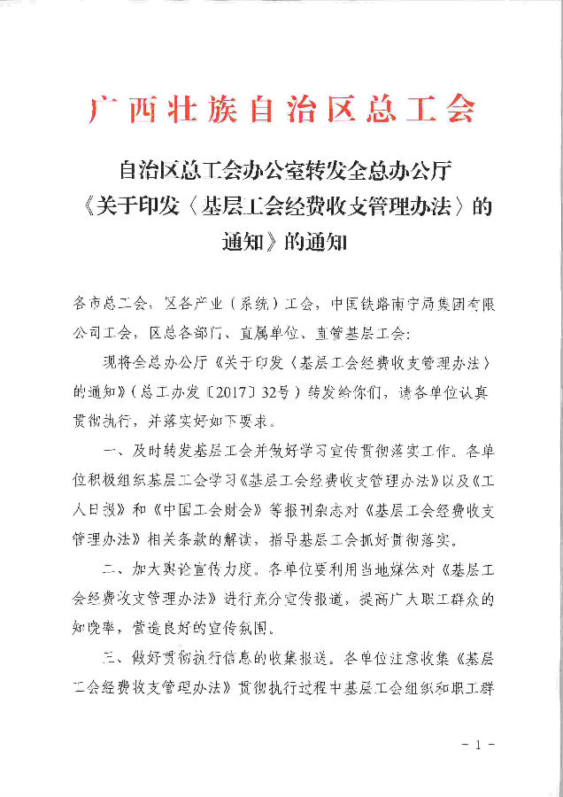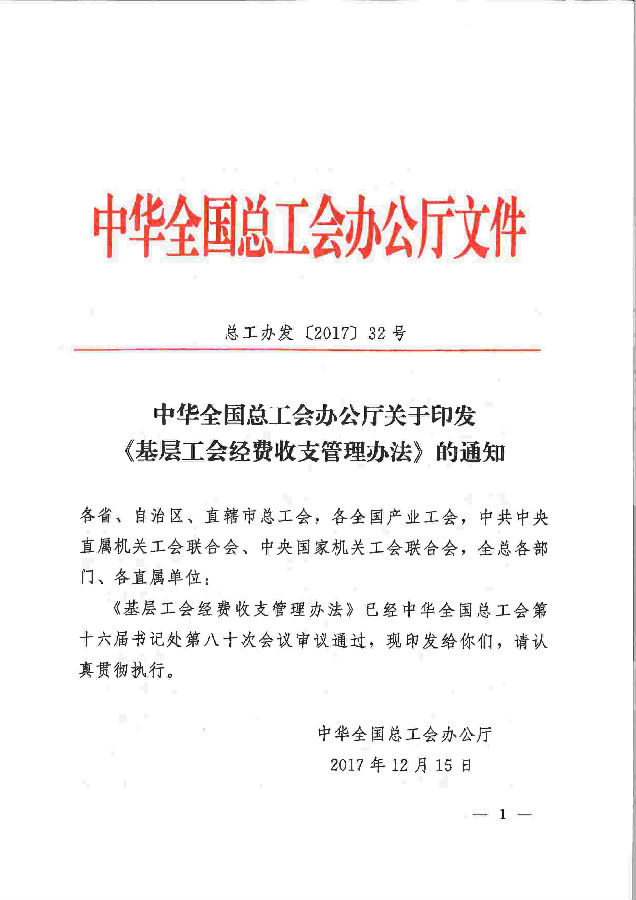 轉發(fā)全總辦公廳關(guān)于基層工會(huì )經(jīng)費收支管理辦法的通知