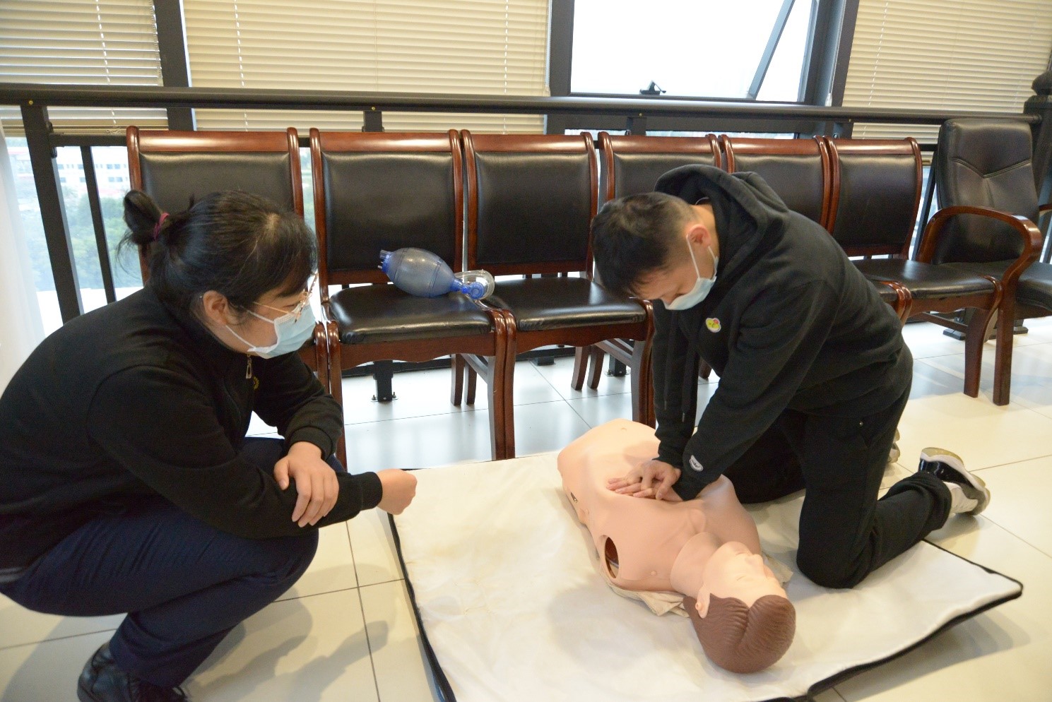 授課現場(chǎng),培訓老師緊扣應急救護重點(diǎn),闡述了心肺復蘇(CPR)的理論知識和重要性,系統講解、全程展示啟動(dòng)應急反應和CPR的全操作流程,操作步驟及注意事項,并使用教具分步演示了如何判斷呼吸、打開(kāi)氣道以及實(shí)施胸外心臟按壓等急救手段,并進(jìn)一步普及了AED(自動(dòng)體外除顫儀)的獲取及使用方式,通俗易懂,生動(dòng)形象。